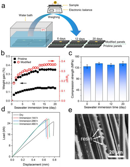 Seawater immersion monitoring and mechanical performance. (a) Schematic of seawater-immersion experiment. (b) Weight gain and ∆R/R0 of the MWCNT-modified panel as a function of seawater-immersion time. The squares and circles denote the pristine and modified samples, respectively. The symbols in black and red colors belong to the weight gain and ∆R/R0 (guided by the arrows), respectively. (c) Compressive strength of wetted panels as the function of seawater-immersion time. (d) Compressive load-displacement curves of panels immersed in seawater for different duration. (e) SEM images of the shear surface after compression and immersion for 20 days.