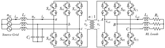 In [], an MPC strategy is proposed for a matrix-converter-based SST whose topology is shown in Figure 1. The considered system corresponds to a single-stage AC/AC SST formed by two matrix converters in back-to-back configuration, connected through an HFT. The system provides two AC ports, which can operate at different voltage and frequency. Furthermore, even though in [] only unidirectional power flow conditions are considered (from the grid to the load-side), this SST enables bidirectional power flow. The proposed control system diagram is demonstrated in Figure 2.