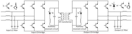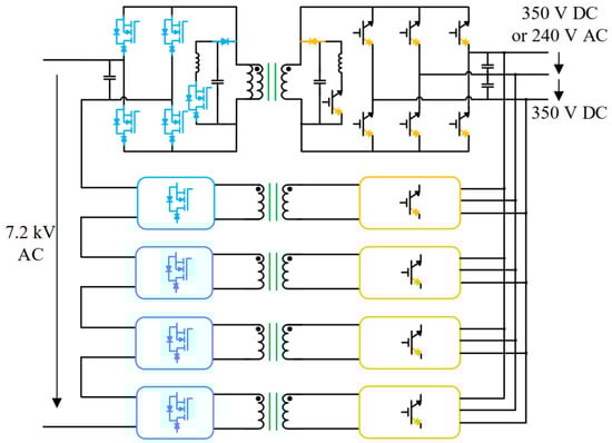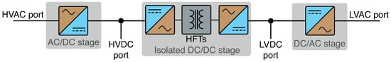 In light of these facts, the solid state transformer (SST) is seen as a highly promising technology to replace the current LFT-based electrical conversion systems [,,,,,]. This might include simple AC/AC conversion systems essentially using an LFT, or more complex systems in which various power electronics converters (PECs) are coupled to an LFT, such as wind energy conversion systems [], railway traction systems [], and EV charging stations []. In basic terms, an SST corresponds to an integrated system that uses PECs and at least one high-frequency transformer (HFT). Thus, in comparison with conventional conversion systems using LFTs, an SST can bring several advantages. Firstly, as in an SST, the HFTs typically operate at a very high frequency (from a few to dozens of kHz) [,], for a given nominal power, SSTs can present significantly lower size and weight [,]. Another huge advantage of SSTs is that they can provide DC ports. This eliminates the need of using several individual AC/DC conversion systems for DC equipment integration. Furthermore, by having an integrated system providing AC and DC ports, a harmonized interconnection of AC and DC systems can be easier to achieve, with the SST controlling the power flowing through these ports. For the sake of clarity, and given the fact that SSTs will be used to replace LFT-based electrical conversion systems which always have at least one MVAC (or HVAC) port, in this paper, it will be considered that a complete SST must always have at least one AC port. In addition, galvanic isolation must always be present in an SST. According to these two aspects, stand-alone converters, multi-converter topologies without galvanic isolation and isolated DC/DC converters will not be considered as complete SST topologies, but as part of them.