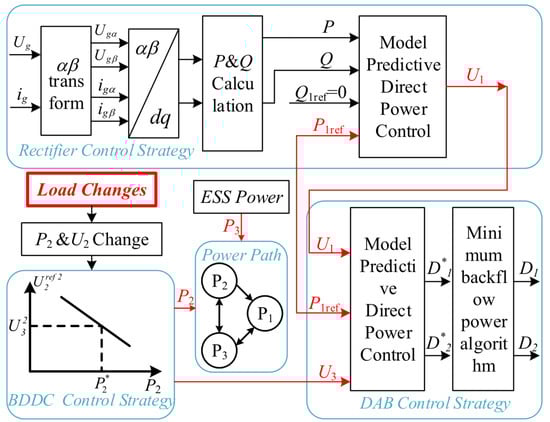 As this figure shows, the considered SST system is specially designed for AC/DC hybrid zonal microgrids, containing a 2LC rectifier, a DAB converter and also a bidirectional DC/DC converter (BDDC), that integrates an energy storage unit. The rectifier is connected to an AC microgrid, which transfers power to the DC microgrid through the DAB converter. The energy storage unit can also supply power to the load in certain situations. As shown in Figure 5, in this work, a hybrid control strategy was considered, which means that not all converters are controlled using an MPC strategy. Thus, the rectifier and DAB converter are controlled using MPC, while the BDDC control method is based on a droop control approach. In this work, additional emphasis is provided to the control law of the DAB converter, which adopts a dual-phase shift (DPS) modulation scheme. This means that two different phase-shift values have to be computed in every control cycle: , which is the phase-shift between the two legs of one bridge and , which is the phase-shift value between the two DAB bridges. Based on the prediction model, the CCS-MPC DAB controller computes these two duty cycle values so that the required active power transfer is achieved. These values represent the inputs of a minimum backflow power algorithm, which aims to minimize the power not flowing in the intended direction (a usual problem in DAB converters). This algorithm aims to conduct adjustments in the phase-shift values, which are finally applied to the respective converter. This procedure starts with the formulation of the following cost for the DAB converter: