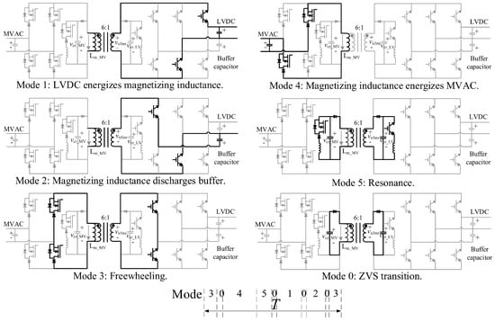 As demonstrated in this figure, the system considers 6 possible modes (switching states). In modes 1 and 2, the energy is transferred from the DC-side to the magnetizing inductance of the HFT, while in mode 4, the energy is sent from that inductance to the AC-side. However, between these switching states, a resonant (mode 5) and ZVS transition (mode 0) switching states are applied to the S4T, to achieve soft-switching. Finally, a freewheeling condition (mode 3) can also be applied to the SST. The main purpose of this mode is to ensure that the S4T operates under constant switching frequency. The switching states activation sequence is also illustrated at the bottom of Figure 9. As previously mentioned, each of these modes will have a dwelling time that is calculated using MPC. These calculations are performed in a DSP and the obtained values are sent to an FPGA. This FPGA runs a state machine and is, therefore, responsible for the power switches activation. In addition to using a slightly different topology, the main novelty of [] in comparison with [] relies on the magnetizing current reference calculation method. In [], a constant value was considered for that reference regardless of the input and output SST current waveforms. Conversely, in [], this reference is dynamically obtained in order to obtain the minimum possible magnetizing current, thus minimizing the overall SST losses.
