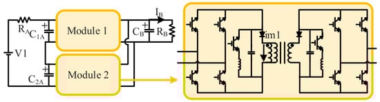 As mentioned in Section 2.1, [] was the first study in which an MPC strategy was proposed for this type of SST. In that work, the system was arranged to perform DC/DC conversion (as demonstrated in Figure 11), and the working principle of MPPS was firstly introduced.
