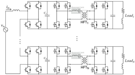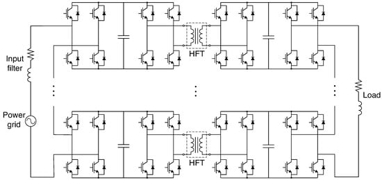 As for DC/DC converters in SSTs, the DAB converter corresponds to one of the most investigated topologies. Some works proposing MPC strategies for DAB converters can be found in the literature. However, in comparison with CHBC and MMCs, the potential of MPC in this type of converter has been significantly less explored. For DAB converters, CCS-MPC approaches are typically adopted [,,,,]. In fact, to the best of the author’s knowledge, only in [,,] strategies based on FCS-MPC have been investigated for this converter. In an SST, it is very common to find not only one but several DAB converters in a modular arrangement, as presented in Figure 20.