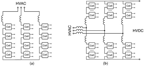 Examples of the most investigated AC/DC converter topologies (CHBC and MMC). (a) 3-phase CHBC, (b) 3-phase MMC.
