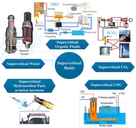 Since 1950, supercritical water has been applied in traditional electric plants to improve thermal efficiency [6,7,8,9]. Supercritical water-cooled reactor Generation IV nuclear power plants have a high overall thermal efficiency of about 33–35% to about 45% due to their high operating pressure and temperature [10]. Similarly, supercritical CO2 has widespread applications in fields such as nuclear reactor cooling systems, solar thermal power systems and trans-critical CO2 heat pumps. The study [11] confirmed that the solar collector thermal efficiency with CO2 as working fluid is higher than that of solar collectors using water, and the heat transfer efficiency can approach 60%. To obtain the optimal energy utilization, power generation systems with organic Rankine cycles for low-grade thermal energy (80–200 °C) conversion have attracted wide attention, and the heat transfer behaviors of organic fluids at supercritical pressure (such as R245fa, R1233zd(E)) were experimentally investigated [12,13]. Additionally, in recent years, with the rapid development of spaceflight and aviation technology, the flow and heat transfer performance of hydrocarbon fuels have also been receiving increased attention [14,15,16,17,18].
