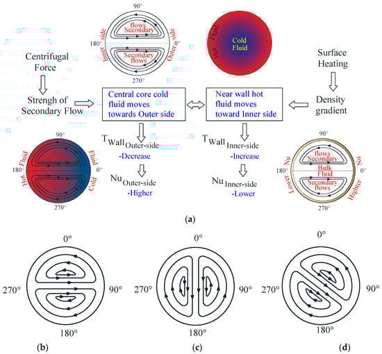 It was accepted that the flow characteristics of fluids at supercritical pressure are mainly affected by thermos-physical properties, boundary condition, flow direction and tube structure. The aforementioned parameters of flow characteristics in a straight tube have been widely studied and reviewed in the open literature [6,9,105,106,107,108,109]. However, the boundary condition effects are related to the thermal-physical properties distribution in the cross section and have no effect on the flow structure. Consequently, their effects on the flow characteristics in curved tubes are mostly the same as in straight tubes, so these will not be covered again. However, differently from a straight tube, a curved tube would lead to two horizontal vortices, which has a significant impact on the flow structure and makes the heat transfer behavior more complicated (as shown in Figure 5a). As is well known, in a straight tube, the tube orientation influence on the heat transfer performance is actually the buoyancy force [59,110,111,112,113,114,115,116]. In the curved tubes, centrifugal force is always perpendicular to the flow direction and has the same effects on the flow structure at different tube orientations. Hence, buoyancy force is also the key factor in the abnormal heat transfer phenomenon with different flow direction and tube orientation [19,48,104]. Due to non-coplanar flow direction and buoyancy force, the gravitational buoyancy can be decomposed into two parts in curved tubes: the first component projected onto radial direction (mainly affecting the circumferential heat transfer distribution) and the second component parallel to the axial direction (mainly affecting the average heat transfer distribution). Therefore, the following discussion on the flow direction is divided into two parts.