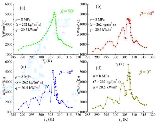 The heat transfer coefficient of supercritical CO2 flowing in helically coiled tube at various dip angles [19]: (a) vertical without oscillation (β = 90°); (b) incline with small oscillation (β = 60°); (c) incline with mild oscillation (β = 30°); (d) horizontal with severe oscillation (β = 0°).