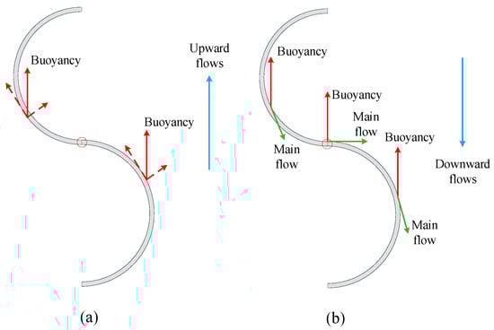 Schematic diagram of buoyancy effect on fluid flow in vertical serpentine tube [30]. (a) Upward flows (the buoyancy force or its component in the same direction as the main flow); (b) downward flows (the buoyancy force or its component in the opposite direction of the main flow).