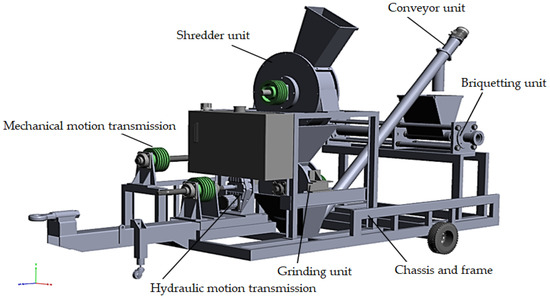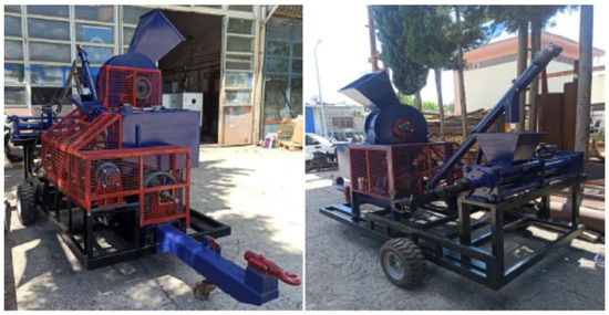 The harvesting waste of peppers, tomatoes, and eggplant grown in greenhouses was used in this study as biomass feedstock. The moisture content of pepper, tomato and eggplant wastes was reduced between 7% and 9%, by drying in the sun under normal conditions as prescribed in the standard EN 14774-1 [37]. The dried wastes were briquetted using a mobile, hydraulic, PTO-driven piston briquetting machine which contains a crusher and grinder with a briquetting range of 0–190 MPa, developed as a prototype (Figure 1 and Figure 2). No binder was used during the briquetting process.