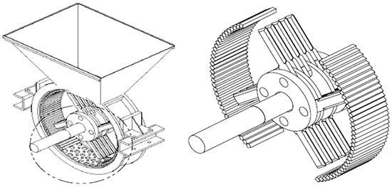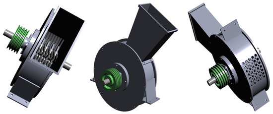 The dried wastes were initially shredded in the shredding unit of the prototype machine, which consists of 40 hammers made of hardox steel and 16 counter blades, which takes its movement from the tractor PTO with the belt-pulley system and rotate at a speed of 2550 rpm. The drawings of the shredder unit, obtained in SolidWorks, are presented in Figure 3, and the isometric assembly drawings are presented in Figure 4.