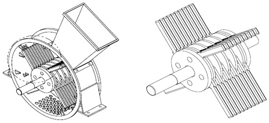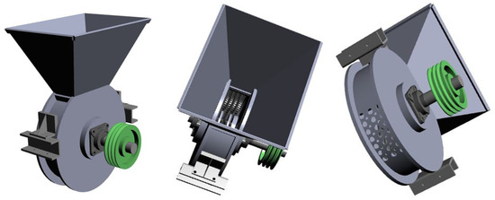 Then, the shredded material taken from the shredding unit to the grinding unit was brought to the required piece size for briquetting in the grinding unit on the prototype machine, which consists of 24 hammers made of hardox steel and 58 counter blades rotating at 2200 rpm. The SolidWorks drawings of the grinding unit are given in Figure 5, and the isometric assembly drawings are seen in Figure 6.
