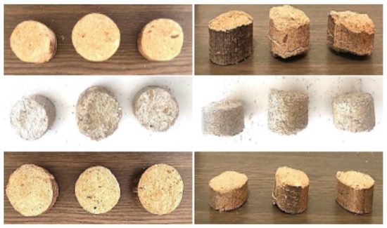 Hazelnut residues [1], a mixture of rice husks and pine sawdust [2], vineyard wastes [16], tea waste [20,21], wood processing residues (sawdust, mulch and wood crisps) [22], woody and herbaceous biomass blends [23], lignite mixed with woody waste [24], sawdust and rapeseed cake [25], palm kernel fibers [26], cotton and sesame stalks [27], various greenhouse plant wastes [28], straws, reed and hemp stalks [29], cotton stalks [30], reed species as energy crops [31], sunflower stalks [32], various energy crops (Salix viminalis, Miscanthus sinensis, Rosa multiflora, Polygonum sachalinensis, Helianthus tuberosus, Sida hermaphrodita and Spartina pectinata) [33], kiwi cuttings [34], corn stalks [35], sugarcane bagasse and straws [36], were previously briquetted in hydraulic presses, piston or conical screw presses with electric motor drive under different briquetting pressures, particle sizes or moisture contents, in order to valorize biomass waste as solid biofuels and contribute to environmental sustainability.