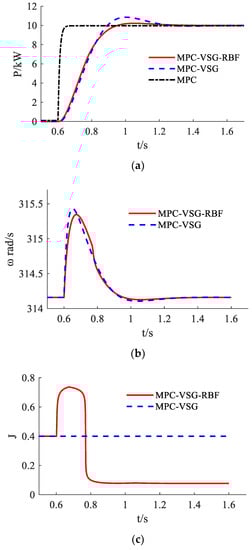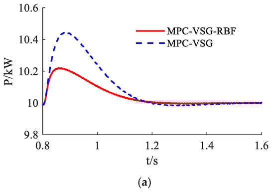 The simulation duration is 1.6 s. In the initial stage, the set value of active and reactive power is 0. To simulate power grid disturbance, active load of 10 kW is suddenly added when t = 0.6 s. In this paper, MPC-VSG-RBF has excellent characteristics that can adjust active power and frequency. The experimental waveform, which MPC control, is shown in Figure 5 and Figure 6; MPC-VSG and MPC-VSG-RBF control are successively carried out.