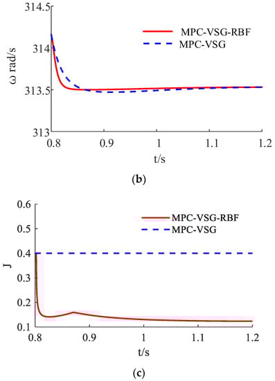 Figure 7 shows results under the disturbance of grid frequency. According to Table 3, when the adaptive control strategy is not adopted, the active power overshoot is 440 W and the settling time is 0.55 s. When using the RBF adaptive control strategy, the overshoot is reduced by 50% and the settling time is reduced by 16%. Without adaptive control strategy, the angular velocity overshoot is 0.06 rad/s. When the RBF adaptive control strategy is used, the overshoot decreases by 50%. In conclusion, the MPC-VSG-RBF control strategy gets a better control effect.