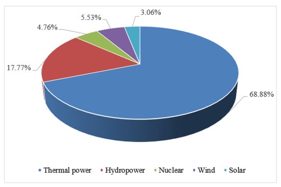 where refers to the type of power source, and refers to the proportion of the power source . Figure 2 presents China’s power generation structure in 2020. In addition, and are presented in Table 1.