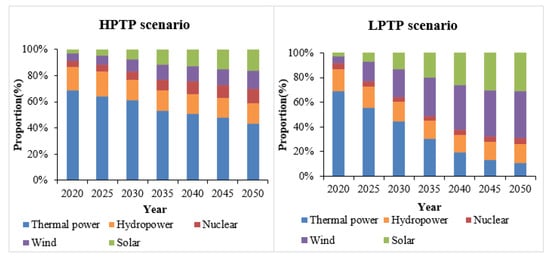 Considering that the ESER effect of BEV depends on electricity production, two power development scenarios were used to further explore the ESER effect of promoting BEVs in China: the high-proportion thermal power (HPTP) scenario and the low-proportion thermal power (LPTP) scenario (see Figure 3).
