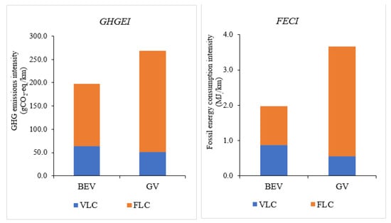 The FECVL and GHGEVL can be obtained by the LCA modeling of the VLC, and the FECFL and GHGEFL can be calculated by Equations (3) and (4).