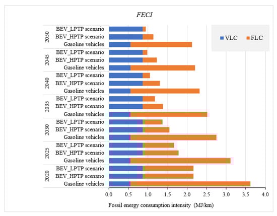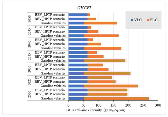 Under the LPTP scenario, the GHGEI of BEVs is expected to drop to 115.61 and 71.84 g CO2-eq/km by 2030 and 2050, respectively. The FECI of BEVs would be 1.37 and 0.95 MJ/km by 2030 and 2050, respectively. In this case, using a BEV instead of a GV can reduce GHG emissions by up to 44.24% in 2030 and 55.81% in 2050 and reduce fossil energy consumption by up to 50.12% in 2030 and 55.45% in 2050.