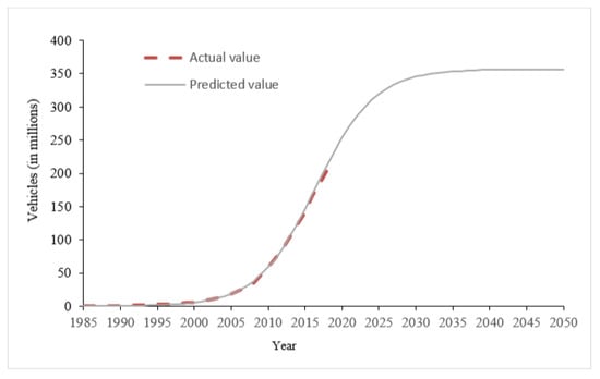 where B and C are positive constants, which can be determined by the initial conditions. Based on the actual data of China’s automobile market from 1985 to 2017 (see Appendix D), the nonlinear least square method (NLS) and SPSS 26.0 software were used to estimate the value of A, B, and C.