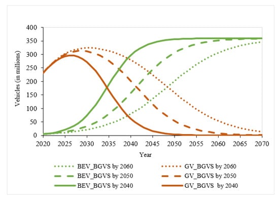 The market evolution of BEVs can be calculated and simulated based on the following assumptions: firstly, the maximum scale of China’s automobile market is approximately 360 million. Second, since the lifespan of passenger cars is approximately 10 years in China [46], it can be assumed that the market share of BEVs will reach around 90% 10 years after the ban on the sale of GVs. Third, there were approximately 5 million BEVs in China in 2020 (i.e., the initial value at t = 0) [68,69]. Fourth, according to China’s NEV Development Plan (2021–2035), the NEV sales will account for 20% of total new car sales in the entire automobile market [70]. Based on the given assumptions, we utilized the logistic equation (see Table 2 and Equation (10)) to estimate the changing trend of GVs and BEVs in the market scale under different BGVS scenarios in China, as shown in Figure 8.