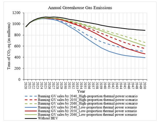 Many countries across the world have formulated a timetable for BGVS [42]. Since China has not yet proposed a clear plan, in order to better explore the ESER potential of the promotion of BEVs, three scenarios were set up in this study, namely, banning GV sales in 2040, 2050, and 2060.