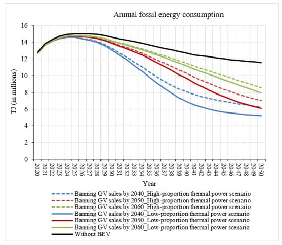 Combined with the FECI and GHGEI of BEVs and GVs in Section 3.1 and the development trends for BEVs and GVs in Section 3.2, the annual FE consumption and GHG emissions from China’s automobile market under different scenarios can be calculated, as shown in Figure 9 and Figure 10.