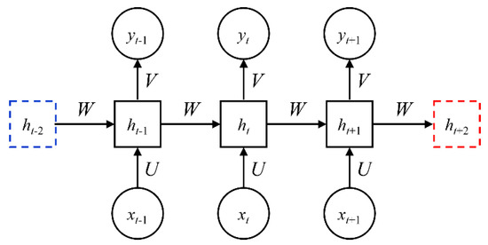 Recurrent neural network (RNN) is a chain-linked artificial neural network with a memory function, whose internal states can display dynamic temporal behavior, as shown in Figure 2. RNN is used initially to describe the relationship between the current output information and the previous information in a sequence, and is mainly used for processing and predicting sequence data. It can transversely transfer data information between neurons and partially express the correlation between data, that is, its hidden layer nodes are interconnected, and the input of the hidden layer not only contains the input characteristics, but also the output value of the hidden layer in the last time step.