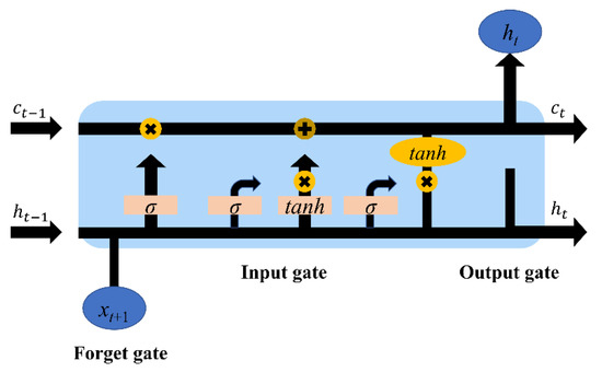 Long short-term memory (LSTM) is a variant of RNN. The hidden layer of ordinary RNN has only one hidden state, , which is very sensitive to short-term input information. However, compared with ordinary RNN, LSTM adds the unit state, , in the structure of the recurrent core, which is responsible for storing the long-term state, so that LSTM can learn long-term dependent information, as shown in Figure 3.