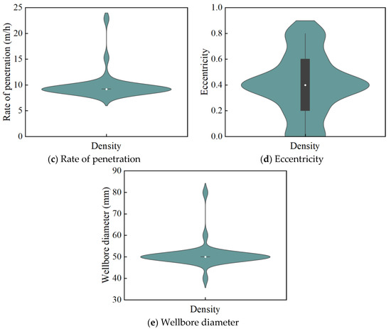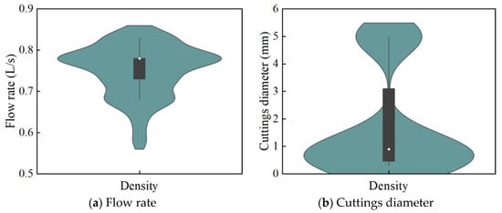 Figure 5 shows the density estimation and box plot of all the input features for the cuttings transport efficiency dataset, which provides insightful information about the distribution and statistical parameters of the dataset. In our dataset, the flow rate ranges from 0.00058 to 0.00078 , the cuttings diameter ranges from 0.0003 to 0.005 , the rate of penetration ranges from 0.00211 to 0.00256 , eccentricity ranges from 0 to 0.8, and the wellbore diameter ranges from 0.04 to 0.08 .