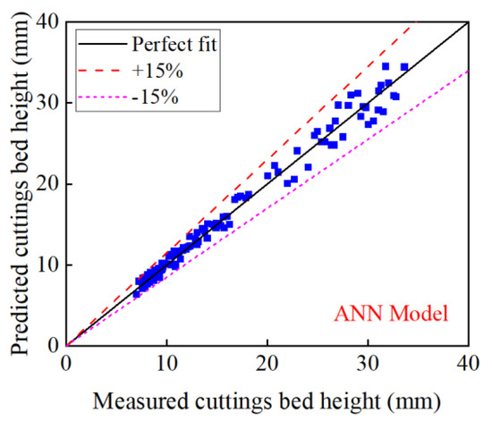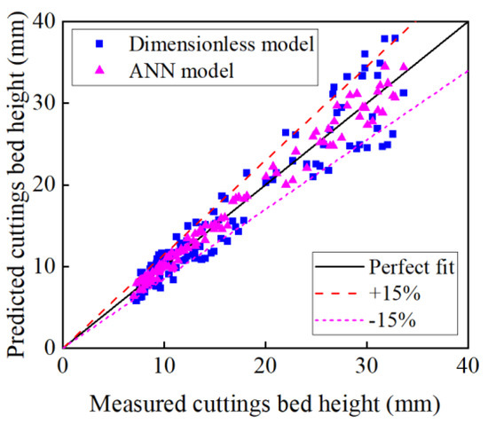 The predicted results of the ANN model are also compared with the dimensionless model predicted by Song et al. (2017) [19], as shown in Equation (5). The AAPE of the dimensionless cuttings bed height model is 9.77%, as shown in Figure 10. In other words, the ANN model performs better than the dimensionless cuttings bed height model.