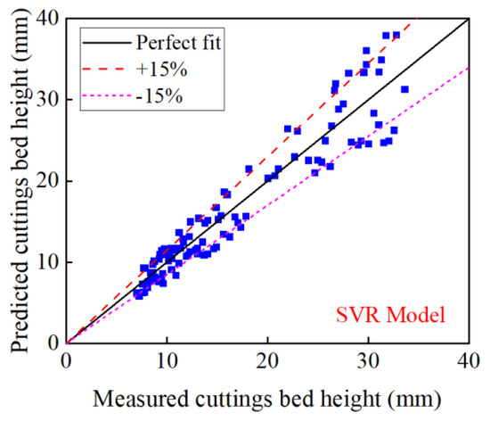 Figure 7 compares the measured cuttings bed height and predicted cuttings bed height with the SVR model. The RMSE, AAE, and AAPE of the SVR model are 2.674, 1.556, and 12.32%, respectively. About 1/3 of all the data points are outside the ±15% error margins.