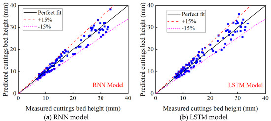 Figure 8 compares the measured cuttings bed height and predicted cuttings bed height with the RNN and LSTM models. The RMSE, AAE, and AAPE of the RNN model are 1.741, 1.356, and 8.12%, respectively. The RMSE, AAE, and AAPE of the LSTM model are 1.955, 2.100, and 9.54%, respectively. It was found that most of the data points are within the ±15% error margins. The prediction accuracies of RNN and LSTM models are better than that of the SVR model, but worse than that of the ANN model.