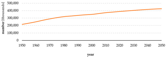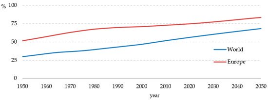 In the European Union, the progress of this concentration is even faster (Figure 3)—in 2050, the percentage of the total population living in cities will be almost 84% (Figure 1).