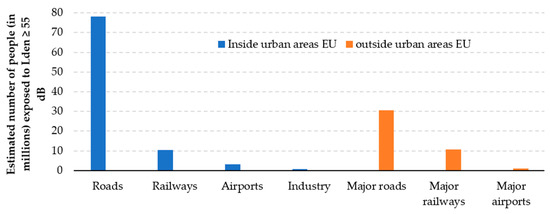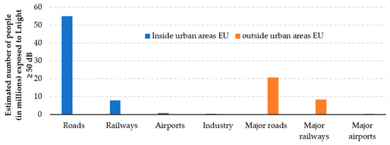 Figure 6. Number of people exposed to average day–evening–night noise levels (Lden) ≥ 55 db in Europe, 2019 [13].