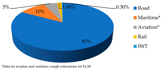 According to [15], road transport is the dominant type of transport and generates by far the highest external costs—83% (Figure 8), of which 31% of the total costs are generated by freight transport.