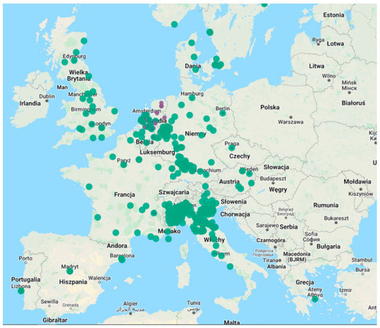 One of the major factors that dictate the modernization of the fleet of these urban-operated vehicles is the increasing introduction of low- and zero-emission zones in some EU countries. In addition, other restrictions on access to urban areas are being introduced there, either permanently or for specific periods of time. This is particularly true for the most polluting vehicle categories [17]. According to the European Cyclists Federation, there are currently more than 250 of such areas functioning within the European Union [18] (Figure 10). Low-emission zones have been already introduced in various European cities, e.g., in Lisbon, Madrid, London, Paris, Rome, Vienna, Berlin and Oslo.