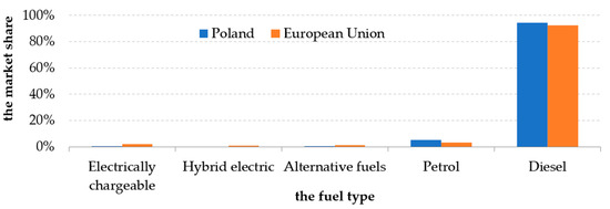 In Poland, along with the planned amendment of the act on electromobility and alternative fuels of 11 January 2018, the legislative authorities intend to introduce regulations that will enforce the creation of clean transport zones in cities with more than 100,000 residents in situations where the Chief Inspectorate of Environmental Protection has found that the maximum acceptable average values of the concentration of air pollutants have been exceeded. As a consequence, zones of restricted access for ICE vehicles (petrol and diesel) will also be introduced in Polish cities. From the perspective of entrepreneurs, this will necessitate the rapid electrification of commercial vehicle fleets, which currently consist mostly of vehicles equipped with diesel engines (Figure 11).