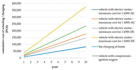 Figure 14. The cumulative cost of refuelling/charging of the analysed vehicles.