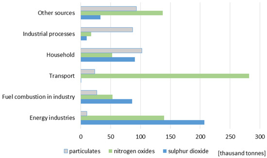 Hard emission coal and lignite as carriers are considered to be the dirtiest types of fuels. During the combustion of these fuels large amounts of carbon oxides, sulfur, nitrogen, mercury, and lead are released into the atmosphere [19,20]. The main causes of pollutant emissions in Poland [21] are shown in Figure 1.