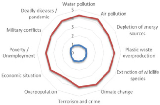 It is noticeable that the awareness of respondents is quite high when it comes to the risks of pollution and climate change. Despite conducting the survey during the time of the global COVID-19 pandemic, this response did not score the highest, but it should still be noted that respondents definitely perceive the threat from diseases. It should also be added that the survey was at a time before the war and the rise of inflation. It can therefore be presumed that it is likely that, now, those taking part in the survey would rate the military conflict and economic situation as factors with a higher degree of threat.
