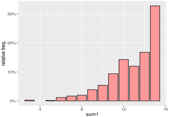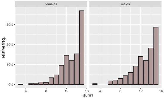 Figure 7 illustrates the distribution of the sum1 trait by gender. Again, gender dependence is evident. To confirm this, we will use the Mann–Whitney U test [50], due to the fact that gender is a binary type trait, so a rank correlation coefficient is not advisable; on the other hand, there are too many values of the sum1 trait for the χ2 independence test [51]. The assumptions of the test are fulfilled because, in our case, the dependent variable, including Likert-scale items, is ordinal, and the independent variable consists of two independent categorical groups (women, men). In addition, the observation independence condition is met because there are different participants in each group, with no participant belonging to more than one group.
