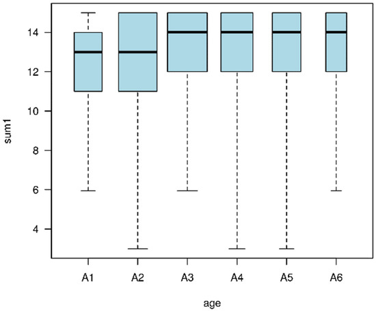 It would be interesting to see if this awareness is at a similar level across age-differentiated groups. Figure 6 shows the boxplots for the magnitude of sum1 across age groups. One can see a slight increase in value as age increases. Both the sum1 value and the age group numbers are expressed on an ordinal scale, the relationship between the data appears to be monotonic, so it makes sense to calculate the rank correlation coefficient, which measures the strength and direction of the relationship that exists. Due to the repeated values of the ranks, it is not possible to apply the Spearman correlation test, so the Kendall correlation coefficient was chosen [49], whose value is 0.0955154. This value is not large, but it confirms the observed direction of influence of these variables. Moreover, the p-value of the significance test (a test confirming that the coefficient is significantly different from zero) is 0.0001227, so we accept with high confidence the hypothesis of an existing relationship consisting in the fact that, on average, an increase in age means a (slight) increase in awareness of the importance of RES.