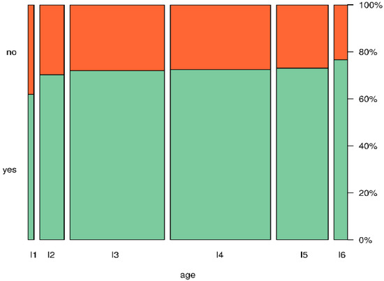 Figure 11 illustrates the relationship between the answer to the question about the use of RES and the educational level of the respondents. In order to correctly perform the χ2 independence test, due to too small numbers in the cells of the contingency tables, it was necessary to combine the first two and the last two groups representing different levels of education. The p-value of the χ2 independence test is 0.00013, which clearly indicates a significant relationship between the answer to the question under consideration and the level of education of the respondents.