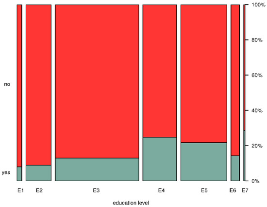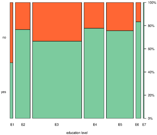The χ2 independence test [52], which is used when testing the independence of non-measurable (qualitative) characteristics or when testing the independence of a qualitative characteristic with a quantitative one was used. When checking with the χ2 independence test, due to the insufficient number of responses in the group with the highest level of education, we combined the last two groups so that the assumptions of the test were met. Despite this combination (combining groups usually blurs the observed relationships), the p-value of the test is 0.0003, so the data clearly indicate a significant relationship between the answer to the question considered here and the level of education.