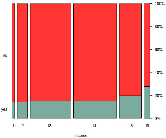Figure 10 illustrates the relationship between the answer to the question about the use of RES (“Do you use RES?”) and the income level of the respondents. The p-value of the χ2 independence test is 0.1396865. For the assumptions of the test to be met, it was necessary to combine the first two groups representing different income levels. The obtained value of the test statistic does not give grounds to state a statistically significant relationship between declaration of RES usage and income level; however, Figure 10 presents evident monotonicity of RES usage fraction with the increase in average income.