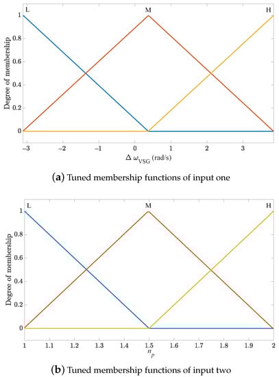 First, the default initial population size was chosen. Each member of the initial population had a unique objective function [24]. Thereafter, the algorithm generates a new population based on the objective function. The optimization approach entails the repeated completion of the procedures shown in Figure 8. The system is perturbed through a unit increase in load demand. The proposed GA optimization is then used to minimize the objective function (24) until the optimization converges, yielding the required controller parameters, resulting in all DERs running at their rated power. The GA is then used to minimize the objective function (24) until the optimization converges, yielding tuned fuzzy-logic controller parameters. Table 2 and Table 3 list the settings of the GA used to optimize the parameters of the fuzzy logic controllers. The parameters of the VSG DERs are shown in Table 4. The tuned input membership functions are shown in Figure 9 and Figure 10, the tuned fuzzy rules are listed in Table 5 and Table 6, and the tuned output membership functions are shown in Figure 11 and Figure 12. The output membership functions in Figure 11 and Figure 12 are of the constant type, which is typically employed in Sugeno fuzzy systems.