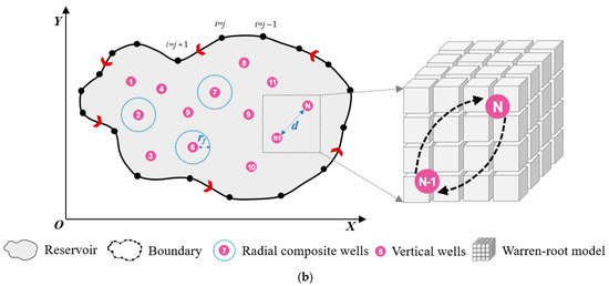 where is the interporosity flow coefficient and is the storativity ratio. The tested well location in the multi-well system is considered to be the origin, and the dimensionless distance in Equation (23) is