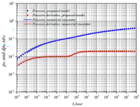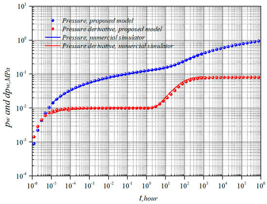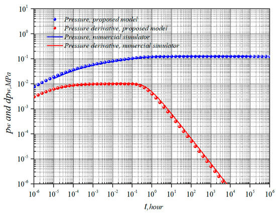 Figure 2 and Figure 3 compare pressure and pressure derivative results from a numerical simulator and the proposed model. In case 1 of the homogeneous model verification, the multi-well system includes two production wells. The tested well is producing at a constant production rate of 1 m3/day. An adjacent well, 50 m from the tested well, is producing at the same constant production rate. In contrast, the adjacent well in case 2 is completing the gas injection process with the same injection rate. The reservoir boundary is set to infinity in two cases. The remaining input parameters of the two cases are shown in Table 3. As the offset well interferes with the testing process of the tested well, Figure 2 shows that the pressure derivative rises at later times and eventually stabilizes at a higher level. When the adjacent well is an injector, the derivative for the tested well in Figure 3 shows a continuous decrease, similar to the effect of a constant pressure boundary. The good agreement between the proposed model and the numerical model in Figure 2 and Figure 3 shows that the proposed model is reliable.