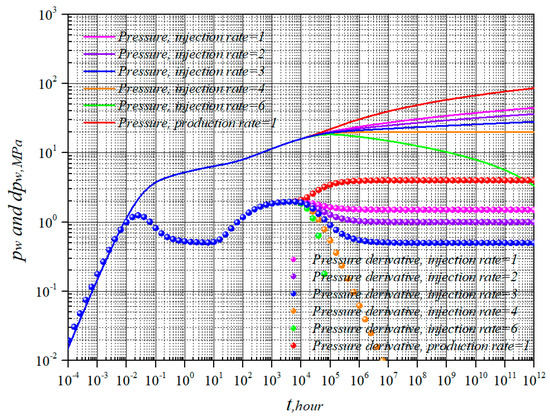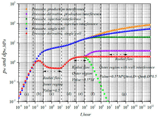 Figure 5 and Table 4 show that wellbore storage dominates the first flow regime. Due to the difference between the production rate at the wellhead and the well bottom, the pressure and its derivative both fall on a straight line with unit slope. The pressure derivative that follows exhibits the effect of a skin factor and includes a hump. The height of the hump is related to the wellbore storage coefficient and the skin factor . The third stage indicates radial flow within the inner zone, as the pressure derivative curve appears as a horizontal line with a value of 0.5. As the pressure response continues to propagate, the transition between the inner and outer regions begins gradually. When the pressure response propagating to the outer zone gradually becomes circular, radial flow in the outer region begins to appear. At this stage, the pressure derivative appears as a straight line, and its value is related to the ratio between 0.5 and the mobility ratio. After the radial flow in the outer region, the features of offset well interference gradually appear. The pressure derivative begins to rise continuously, indicating transitional flow. As well interference gradually increases, the characteristics of the entire multi-well system gradually appear. Finally, radial flow appears in the multi-well system. At this time, the horizontal derivative curve during radial flow of the multi-well system can be divided into two parts: the radial composite feature of the tested well and the adjacent well interference. The radially composite feature results in the horizontal line values related to 0.5, mobility ratio, and dimensionless production rate of the tested well. Well interference also causes the horizontal line value to relate to the dimensionless production rate of the offset well and 0.5. If offset wells are in the process of gas injection, the pressure derivative shows the characteristic of drop-off. The comparison of the newly added single-well model in Figure 5 shows that the pressure derivative of the single-well model finally stabilizes at the horizontal line with the value of 0.5 M.
