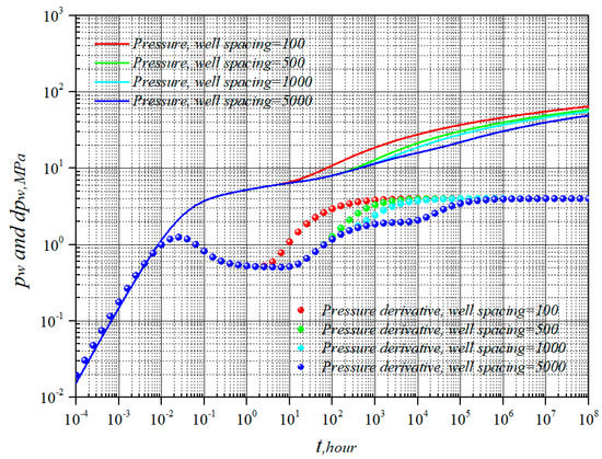 Figure 6 shows the effect of well spacing on the pressure transient behavior of tested wells in the multi-well system as well spacing is gradually increased from 100 m to 5000 m. We can draw the conclusion that the variation of well spacing affects the radial flow regime in the inner region, the transitional flow between the inner and the outer regions, the radial flow in the outer region, and the pseudo-radial flow in the multi-well system. As well spacing increases, the duration of radial flow in the inner region increases gradually. The starting time of the radial flow of the multi-well system is proportional to the well spacing. When the well spacing is 100 m, the tested well and adjacent wells can easily communicate with each other to form a whole. In this case, the flow regimes are simple. Radial flow in the inner region is followed by a long transitional flow regime. This transitional flow is controlled by a combination of radial composite features and well interference. Since the well spacing is the same as the composite radius, the characteristics of well interference mask the radial flow feature of the outer region. The pressure derivative rises. With the gradual increase in well spacing, the transitional flow regime between the inner and outer regions, the radial flow regime in the outer region, and the transitional flow during well interference gradually emerge. As the well spacing increases to 1000 m, the transitional flow between the inner and outer regions begins to appear. When the well spacing increases to 5000 m, the pressure derivative exhibits both radial flow in the outer region and transitional flow that characterizes interference.